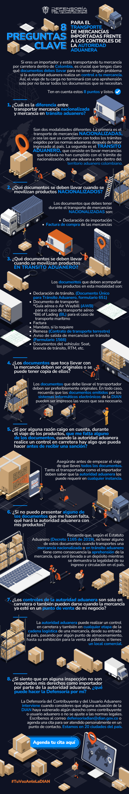 Si durante este proceso aduanero consideras que el funcionario de la autoridad aduanera ha vulnerado tus derechos, puedes contactarte con la Defensoría del Contribuyente y del Usuario Aduanero a traves de nuestros canales oficinales. Escribenos a defensoria@dian.gov.co, dirigete a alguno de nuestros puntos de atencion presencial o agenda tu cita aquí.
